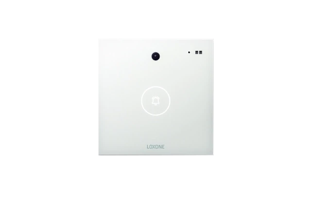 Die Loxone Intercom ist eine kompakte Video Türsprechstelle mit Glasfront, beleuchteter Klingeltaste und Näherungssensor. Das Mikrofon ist in der Frontplatte, die Lautsprecher unsichtbar an der linken Gehäuseseite integriert.